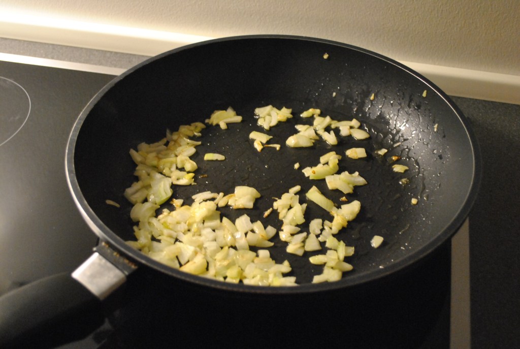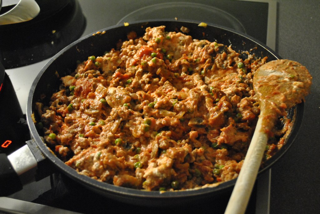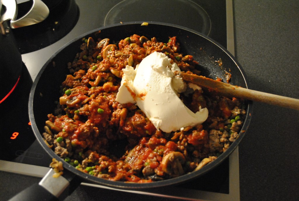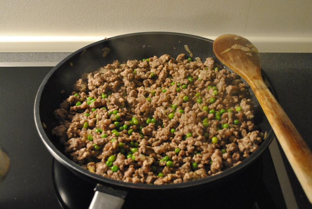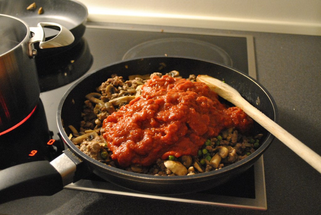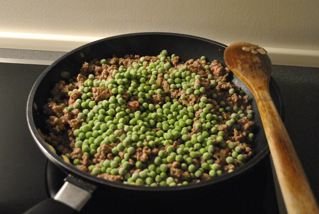 I en stor pande sauterer du det hakkede løg. Tilsæt bagefter det hakket kød, salt og peber og brun det. Skru lidt ned for varmen, tilsæt ærterne og lad det hele koge godt ind. Når det er kogt, tages det af varmen. Til sidst, den kogte tomatsauce og ricotta blandes i. Hold til side.