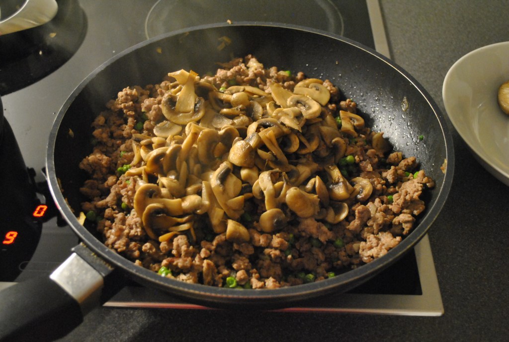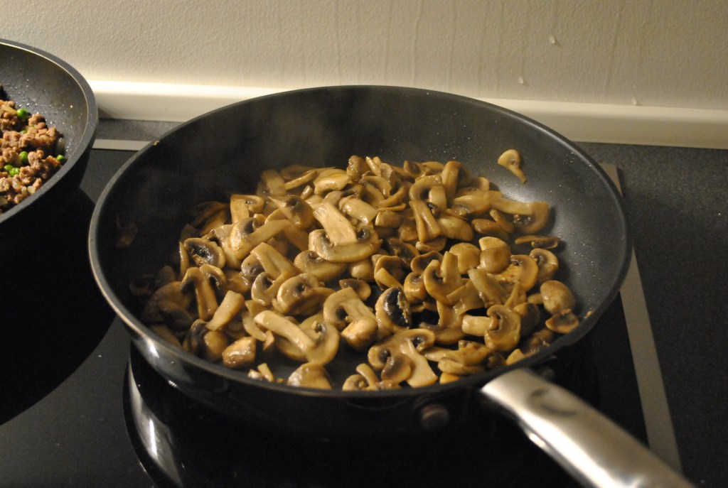 Bring i mellemtiden vand i kog i en gryde. Tag en anden pande, smelt lidt smør heri og svits de skivede svampe. Når det er kogt, tilsæt lidt salt og peber. Og så kommer svampe i panden med kødet.